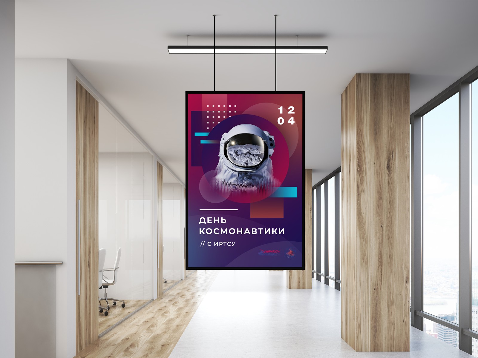 В основе визуальной концепции — образ шлема космонавта с отражением поверхности планеты, который символизирует исследование космоса и взгляд человека на новые горизонты. Композиция дополнена геометрическими формами, цифровыми элементами и волнообразной графикой, создающими ощущение технологичности и динамики.
