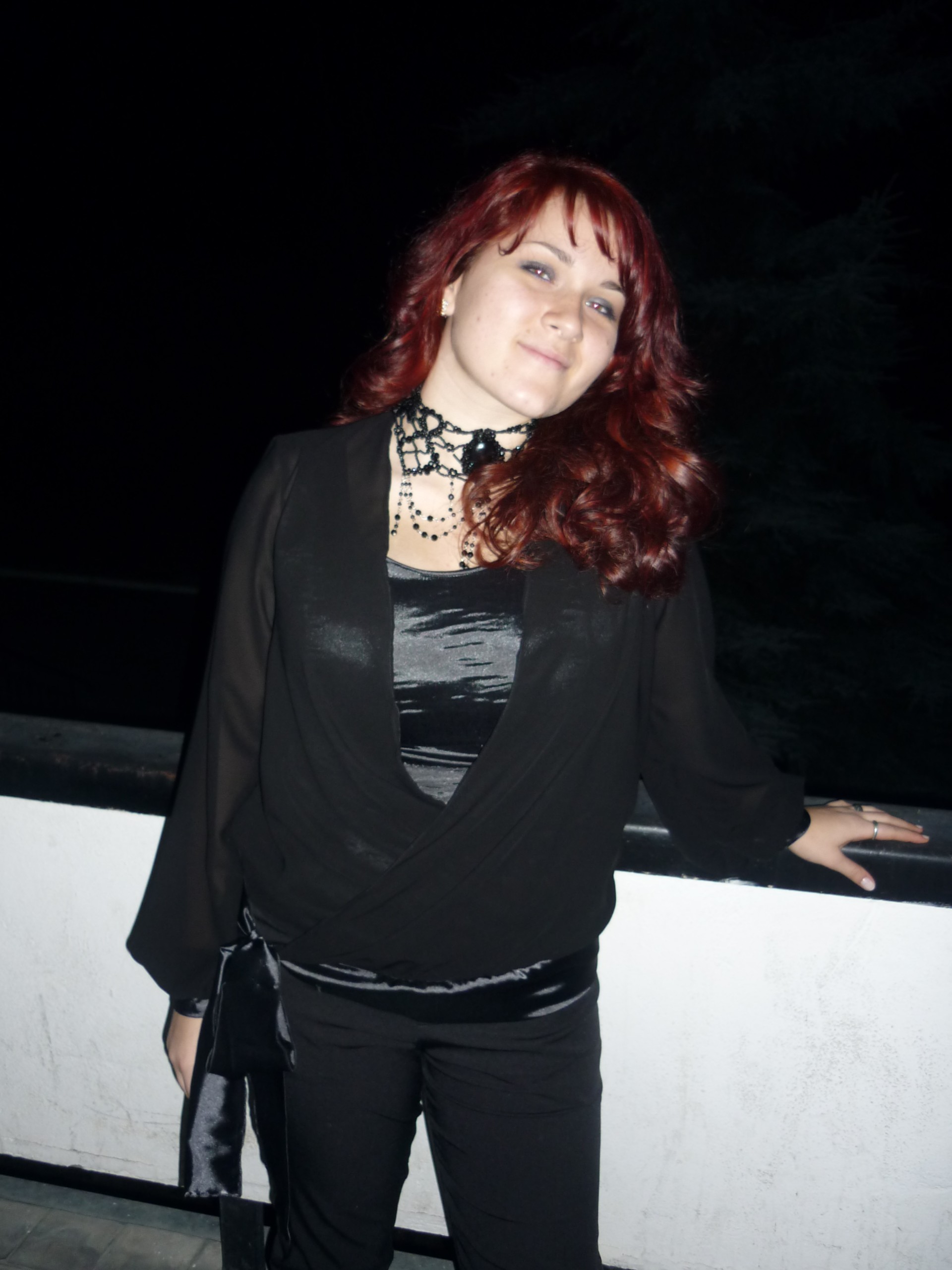 Был придуман и отшит образ в готическом стиле. В него входят: брюки прямые из костюмной ткани, корсет атласный со шнуровкой на спине, блуза шифоновая с манжетами и бантом на заниженном поясе. Дополнен колье в готическом стиле ручной работы.