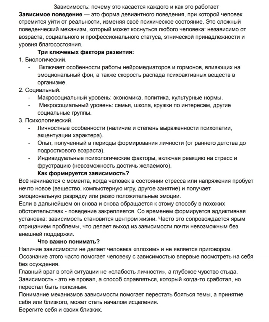 Краткий информационный пост по теме зависимости. Цель: рассказать из чего состоит зависимость и развеять мифы окружающие это явление.