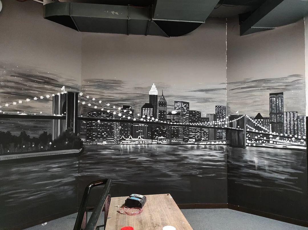 Оформлены лестничные пролеты в чб росписях. Секции бокса и ресторан в одном здании . Акрил