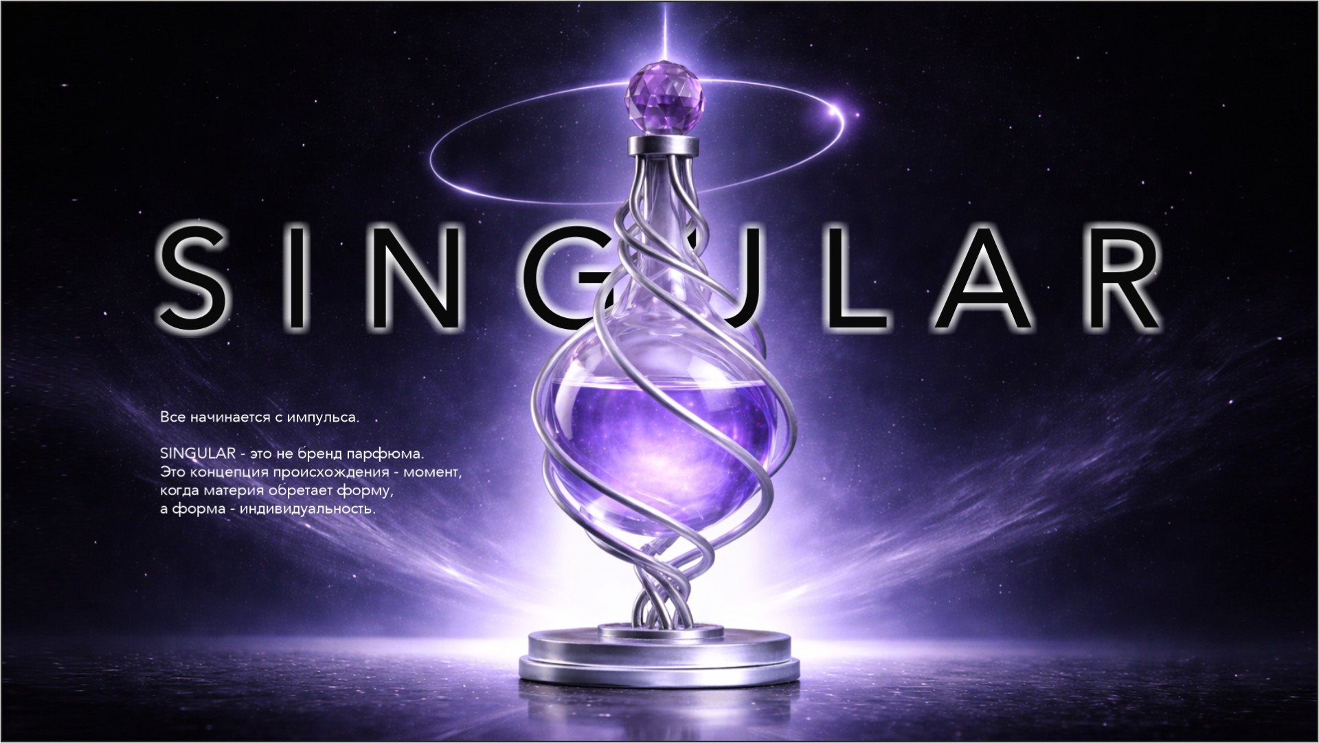 SINGULAR - концептуальный парфюмерный бренд, построенный вокруг идеи начала. Он про тот момент, когда восприятие начинает обретать форму. Когда появляются индивидуальность, содержание, эмоции. Аромат здесь не дополнение. Это точка отсчёта. Переход от неопределённого к определённому. До него нет формы. Нет чёткого состояния. Нет личности.